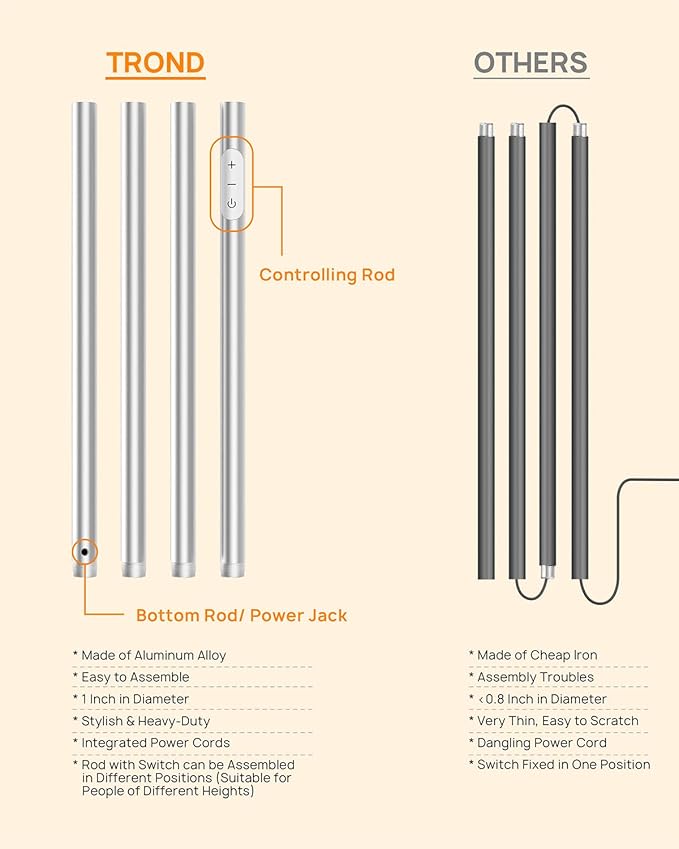 - Easy to Assemble: It innovatively features 4 modular aluminum rods, all of which have the integrated power cords built inside. This design gives you the convenience & flexibility to assemble, disassemble and adjust the height. Its total height is 180cm/71in, taller than other similar lamps, so that you won’t stare directly at the bright light