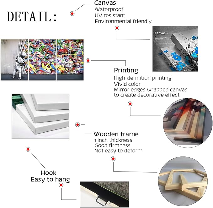 - Graffiti Canvas Wall Art: The HD canvas is stretched on a solid wood frame and printed with great industry materials, the canvas material is durable, waterproof and stain resistant. It effortlessly preserves the original beauty of the painting and is easy to store, making your room more cozy and beautiful.