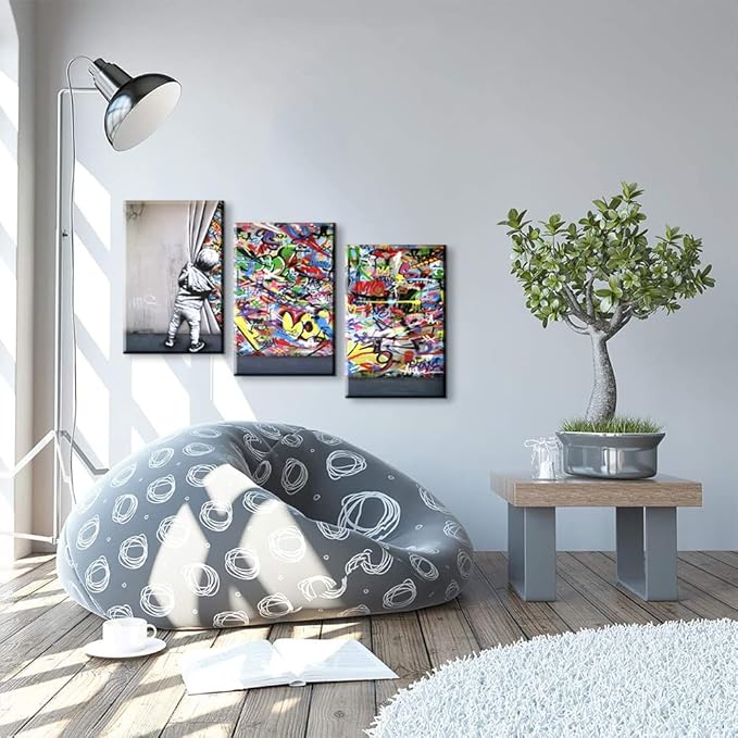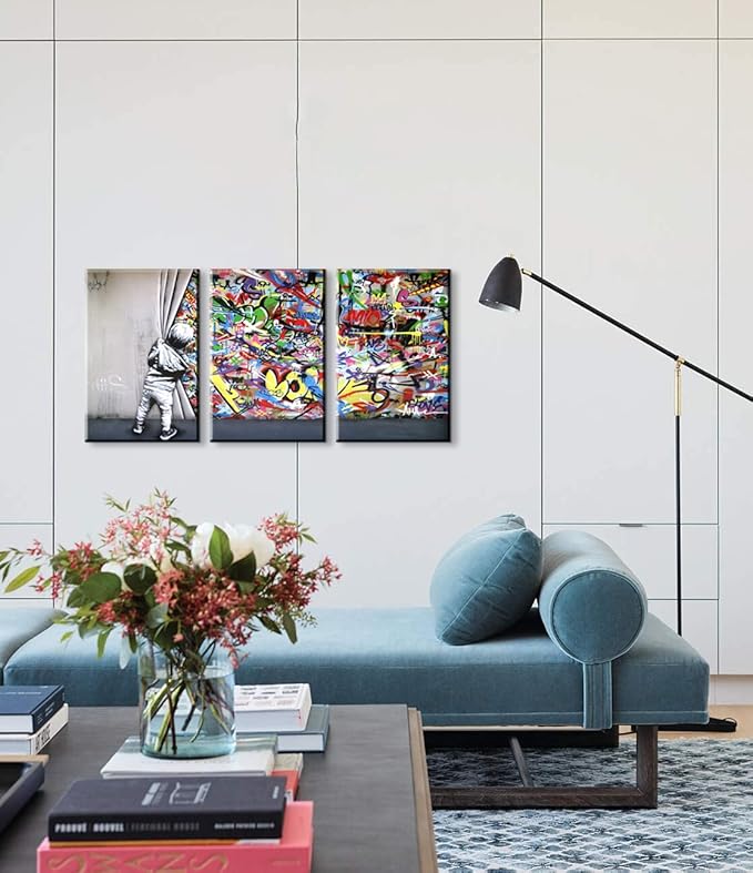 3 Pieces Banksy Wall Art Graffiti Wall Art Behind the Curtain Wall Art Colorful Decor Banksy Canvas Wall Art Pop Art Graffiti Canvas Wall Art Street Art Banksy Canvas for Room Decor (16''Wx24''Hx3PCS)