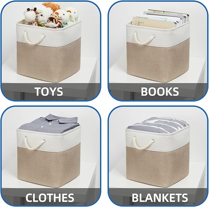 Temary Cube Storage Baskets 4 Pack 13x13 Fabric Cube Storage Bins for Clothes, Large Baskets Boxes with Handles, Canvas Basket for Organizing Towels, Collapsible Storage Bins (White&&Khaki)