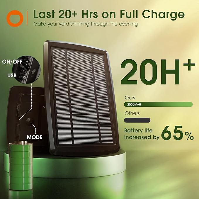 - Dual Charging: Solar Powered & USB Charging: Solar panel with a 180-degree adjustable design for optimal sunlight exposure. USB charging capability ensures continuous operation during prolonged cloudy or rainy periods. The 5000mAh high-capacity energy panel provides 15-20 hours of usage on a full charge