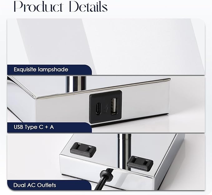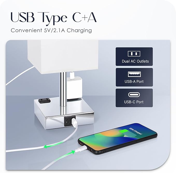 - USB C+A and AC Outlets: In addition to providing light, this modern bedside table lamp has a USB C & USB A(5V/2.1A) port and two AC outlets (120V)