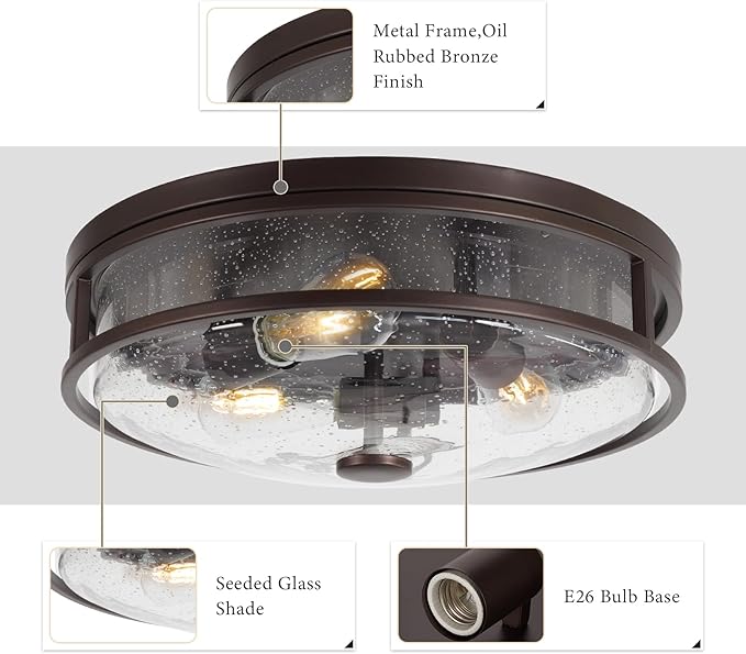 16 Inch Large Flush Mount Ceiling Light Fixture with Seeded Glass, Bronze Round Ceiling Lamp Shade, Modern Farmhouse Indoor Outdoor Ceiling Lighting for Kitchen Dining Living Room Foyer