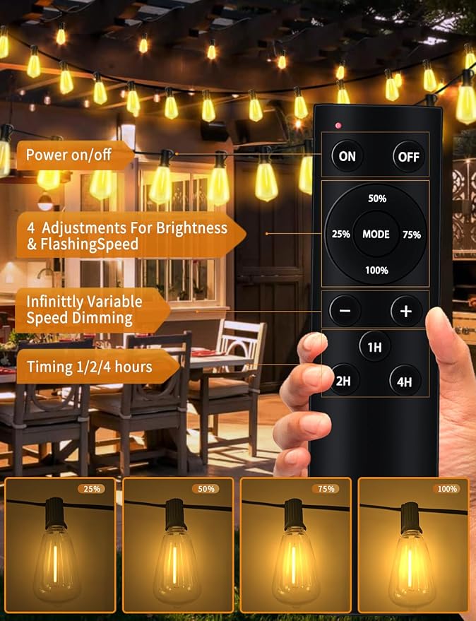 - 【DIMMABLE OUTDOOR STRING LIGHTS WITH REMOTE】 ST38 Outdoor led lights no need to buy an extra dimmer. One remote can handle it all. Outdoor string lights compatible with most dimmers to achieve better lighting flexibility. And provides 1/2/4h timer options, so you never have to worry about leaving the balcony lights on after night gatherings. 3 different edison bulb string lights outdoor modes to satisfy your diverse needs.