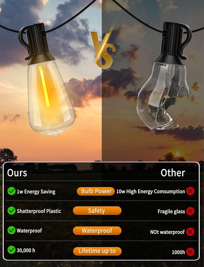 - 【ENERGY EFFICIENT OUTDOOR LIGHTS FOR PATIO】100ft Extra-long patio string lights are equipped with our upgraded wires and 52 ST38 shatterproof Edison bulbs. Patio lights outdoor waterproof with 1W Led ST38 bulbs reduce your 90% electricity bills, compared to incandescent bulbs. Outside lights for yard boasting an incredible lifespan of up to 30,000 hours.