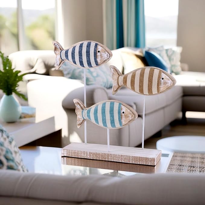 - Versatile Display: These fish statues can be placed on shelves, tables, adding a touch of coastal charm to any room. Creating a rustic and nautical charm that brings a beachy feel to your living room, office, bedroom, lake house or any space that needs a touch of the seaside. Perfect for placing on shelves, tables or mantels.