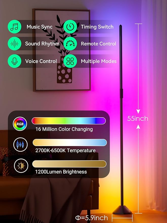 - 【Remote&Voice Control】You can control the led floor lamp through the RF remote control, which is not affected by obstacles. This WiFi corner lamp works with Alexa and Google Assistant, so you can also use APP or Voice to control the lamp, it has a variety of scenes and functions, you can adjust according to your preferences and habits DIY.