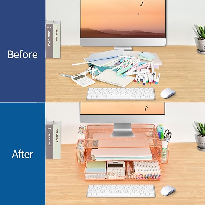 - Space Saving: Our dual-tier desktop organizer with drawer and 2 pen holders stores office supplies and office desk accessories neatly. As a purpose monitor riser, it keeps your workspace organized, helping you focus and work efficiently