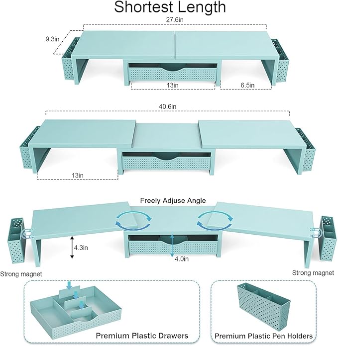 - 【Ample Storage Space】The dual monitor stand features two magnetic pen holders and a drawer, allowing you to easily organize your desk accessories and office supplies, keeping your workspace clear and tidy for easier access.
