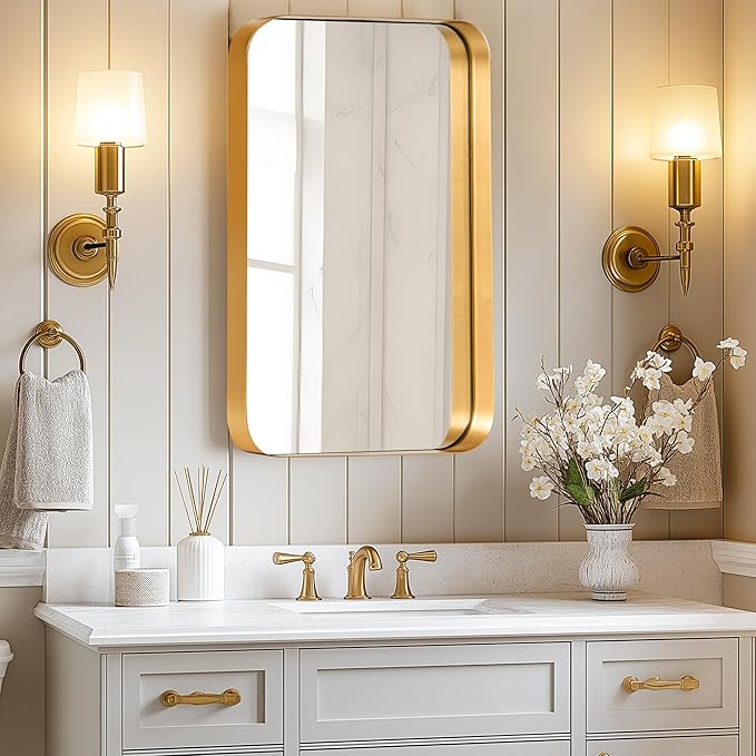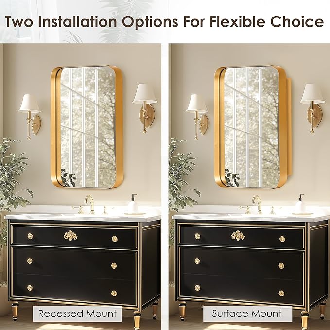 - 【Sophisticated Design with Timeless Elegance】Elevate your bathroom decor with our stunning wall mount medicine cabinet. The gold vanity mirror adds a touch of luxury, while the sleek and sophisticated design blends seamlessly with both modern and traditional bathroom styles. Transform your bathroom into a refined and functional space with this exquisite piece.