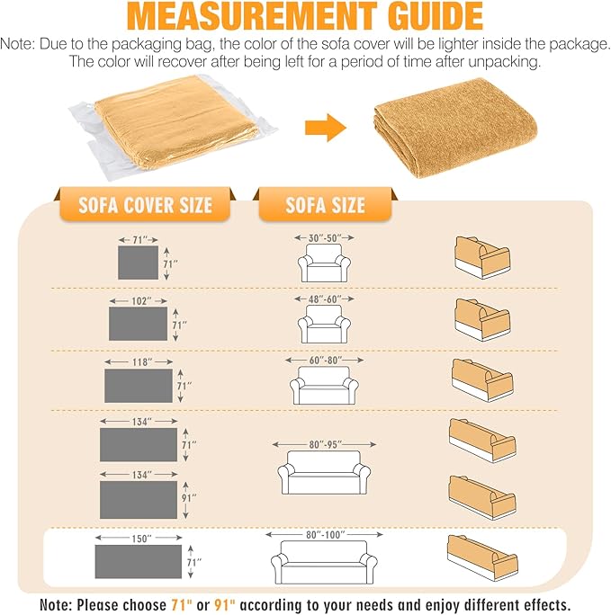 - SIZE SELECTION & NOTES: We offer a range of couch cover sizes suitable for most types of furniture; Please measure your sofa before purchase and refer to the measurement guide in our pictures for best results; DUE TO THE PACKAGING BAG, THE COLOR OF THE SOFA COVER WILL BE LIGHTER INSIDE THE PACKAGE; THE COLOR WILL RECOVER AFTER BEING LEFT FOR A PERIOD OF TIME AFTER UNPACKING