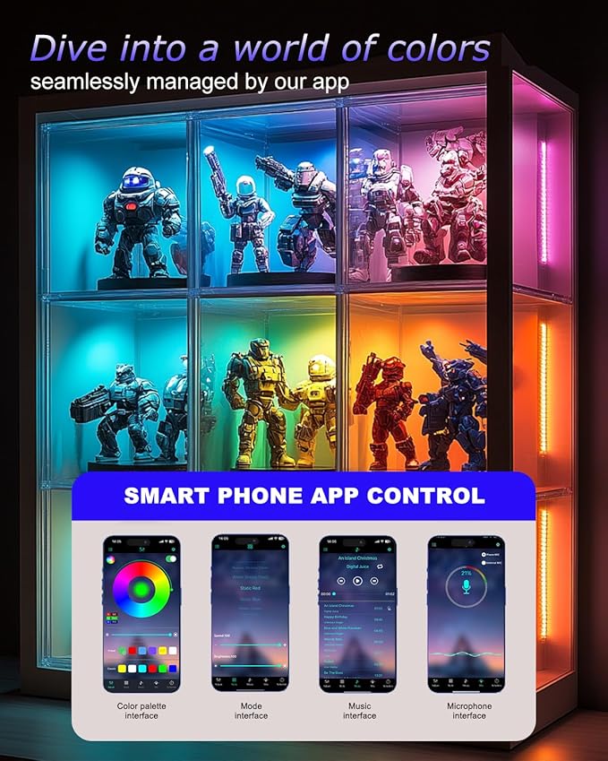 - - Smart Control Options: Easily manage your lighting with 3 control methods:Remote Controller, Phone App or in-line Control box receiver. Enjoy advanced features like brightness adjustment (0%-100%), color customization, and music synchronization for an immersive experience.