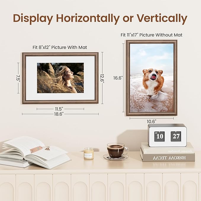 - Solid Walnut Frame: Crafted from USA-sourced walnut wood, our picture frame showcases striking wood grains that enhance its authentic and natural charm. This 11x17 picture frame comes with mat(Opening Size-7.5x11.5) for 8x12 inch picture. Wooden picture frames without mat opening fits a standard 11x17-inch photo.