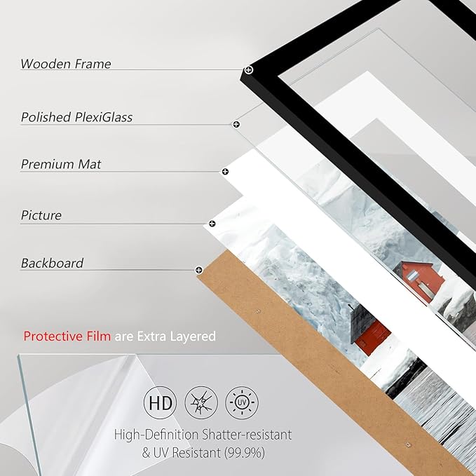 - USER-FRIENDLY DESIGN - This 20x30 picture frame with mat is very easy to use: simply rotate the tabs to remove the back panel and insert your photos. The spring-loaded backing makes access effortless. For optimal clarity, remember to remove the protective film from the plexiglass before displaying your photo.