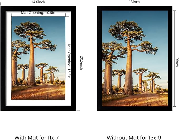 - 2 SIZES, 1 FRAME – 11x17 or 13x19? You decide. Our poster frame showcases its flexibility by including a mat, allowing you to choose the perfect fit.