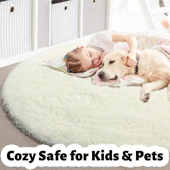 Amdrebio Ivory White Round Circle Rug 6Ft for Kids Bedroom Aesthetic, Big Washable Fluffy Fuzzy Area Rugs for Living Room, Circular Plush Soft Shaggy Cream Carpet for Baby Nursery Teen Girls Boys