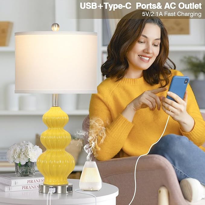 - Exquisite Triple Gourd Lamps:This yellow bedside table lamp design with unique triple gourd ceramic lamp body and finished in a natural linen white lampshade which is perfect combination of modern and ceramics style that adds artistic and elegance to your space. Our yellow table lamps not only illuminate your home, but are a unique home decor