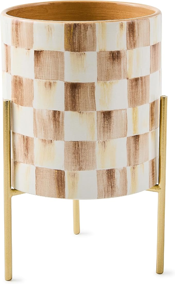 - ELEGANT PLANT HOLDER: This checkered ceramic pot features our espresso-inspired Mocha Check brown-and-white pattern, which is the perfect complement to your greenery. It also has a gold-painted metal stand that lets you move the pot with ease.