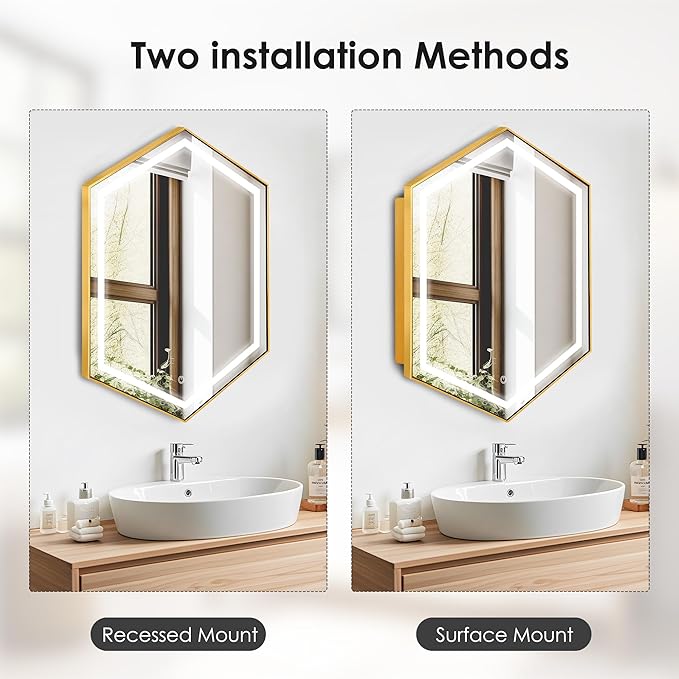 - 【Hexagon Mirror Shape】Combining beauty and functionality, this black/gold/silver medicine cabinet with mirror features a hexagon-shaped design that adds a touch of natural elegance to your bathroom. Its mirrored surface not only improves visibility but also creates an illusion of spaciousness, making your bathroom feel more open and inviting