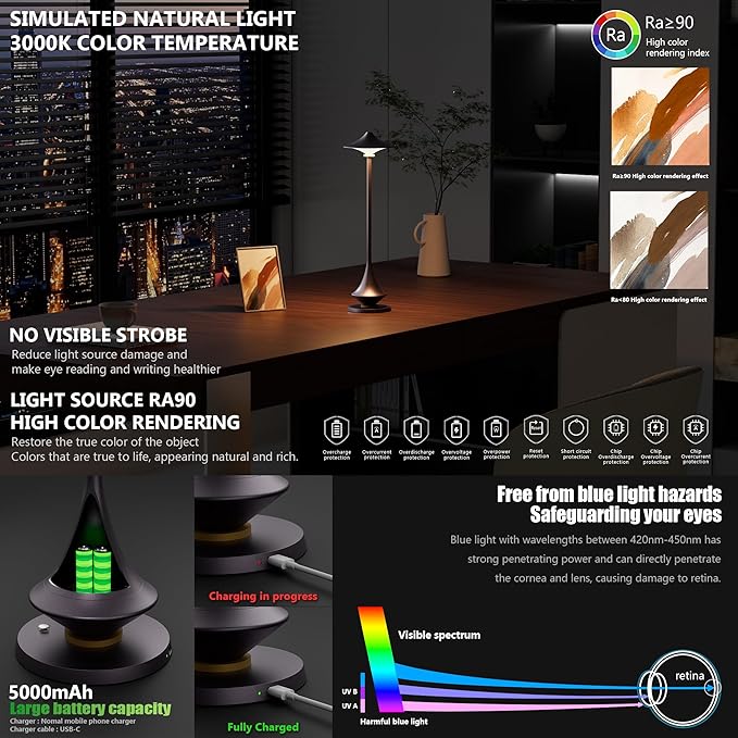 - Cordless Freedom: Innovative cordless design eliminates unsightly wires and offers complete flexibility in placement, allowing you to position the lamp anywhere in your home or office