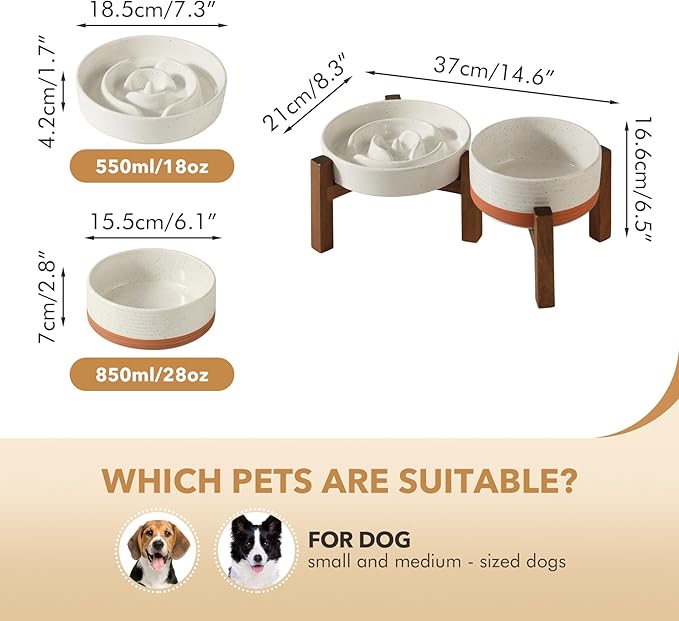 Ceramic Raised Slow Feeder Dog Bowl Set, Elevated 6.1inch Bowl and 7.3inch Dish with Acacia Wood Stand for Small and Medium Dogs(2 x Vanilla White+ Stand)