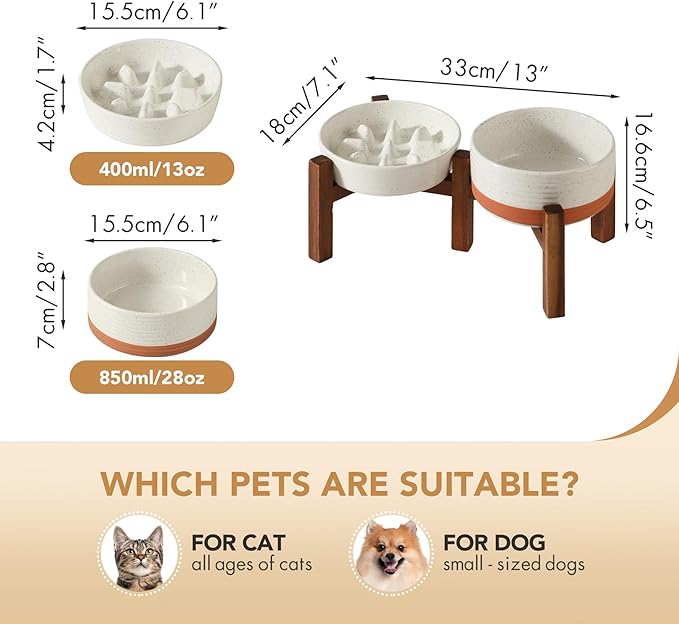 Ceramic Raised Slow Feeder Dog Food and Water Bowl Set for Fast Eaters, Elevated 6.1inch Bowl and 6.1inch Dish with Acacia Wood Stand for Small Dogs (2 x Vanilla White+ Stand)