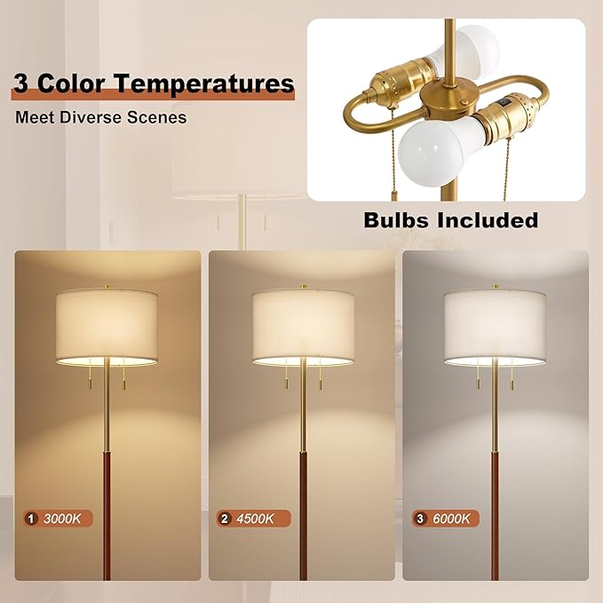 - 3-Color Temperature Control with Pull Chains: This modern floor lamp features dual E26 sockets with Individual pull chains, allowing you to customize lighting warm/neutral/cool white for any mood. Includes a convenient foot switch (Note: both switches must be ON to control lighting)