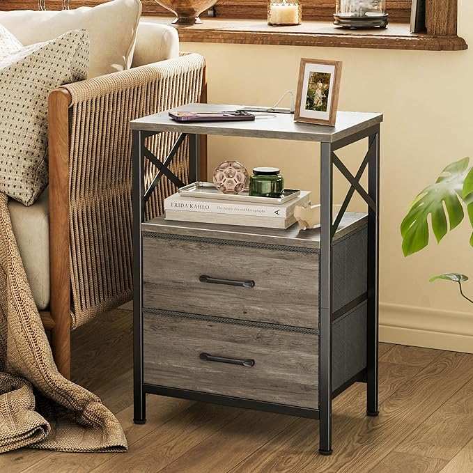 - 【Night Stand with 2 Drawers] A compact end table with surprisingly large storage! Thetabletop fits your lamp, books, or coffee cup easily, while 2 fabric drawers and an open shelf keep remotes, chargers, or bedtime reads neatly tucked away. Finally, a nightstand that actually holds everything you need