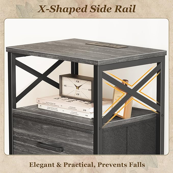 - 【Durable Build with Stylish Details】Built to last with scratch-resistant, waterproof engineered wood and a sturdy powder-coated steel frame. The wood-grain finish adds warmth to your space, while the square metal handles and X-shaped side design give it that clean, modern charm. Beautiful and reliable — just how bedside table should be
