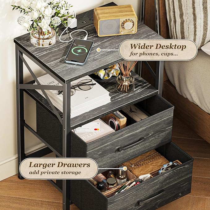 - 【Night Stand with 2 Drawers] A compact end table with surprisingly large storage! Thetabletop fits your lamp, books, or coffee cup easily, while 2 fabric drawers and an open shelf keep remotes, chargers, or bedtime reads neatly tucked away. Finally, a nightstand that actually holds everything you need