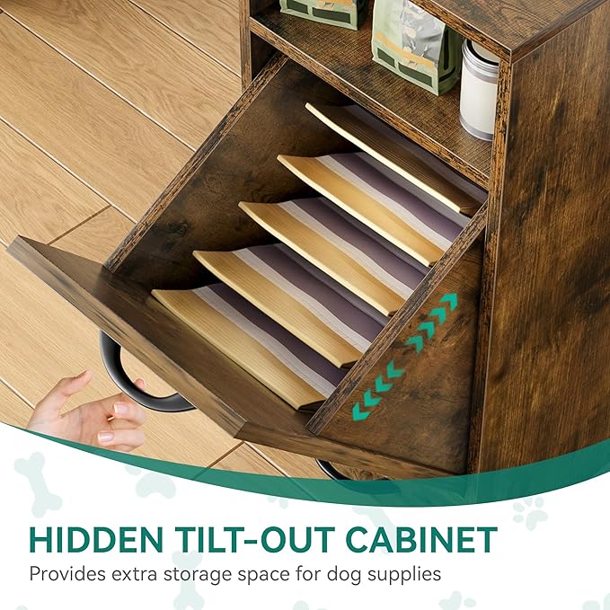 - Hidden pet feeder: When the dog is eating, pull out the storage at the bottom to reveal two dog food bowls, one for food and the other for water. When feeding time is over, push it back away from dust, debris and dog hair