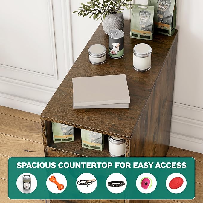 - Pet supplies storage: The tilted pet storage cabinet includes a tilted dog food storage cabinet and a spacious open compartment for storing all your pet supplies. The countertop can hold photo frames or snacks.