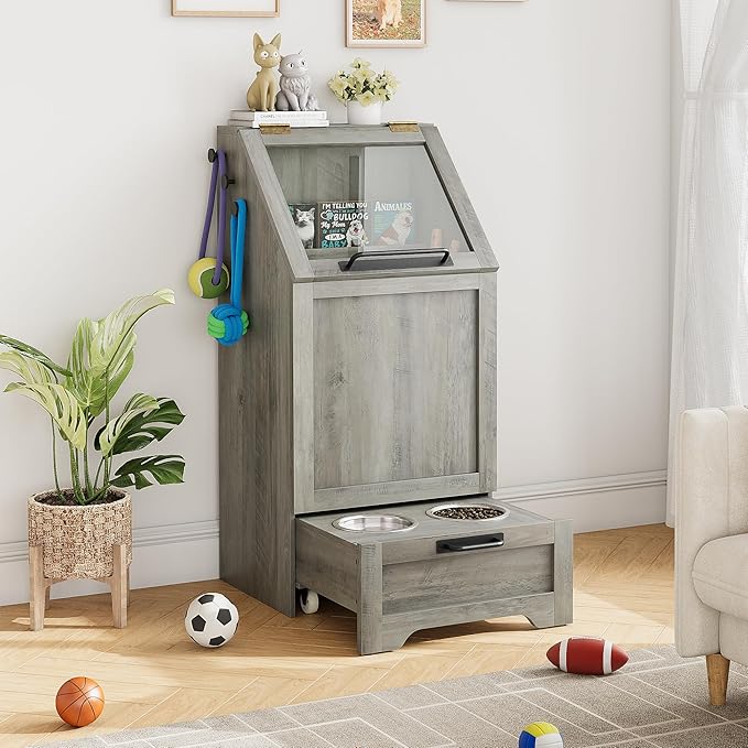 Dog Feeding Station with Storage - Large Capacity Dog Food Storage Cabinet with 2 Removable Stainless Steel Bowls, Flip Top Pet Food Container Toy Storage Organizer - Grey