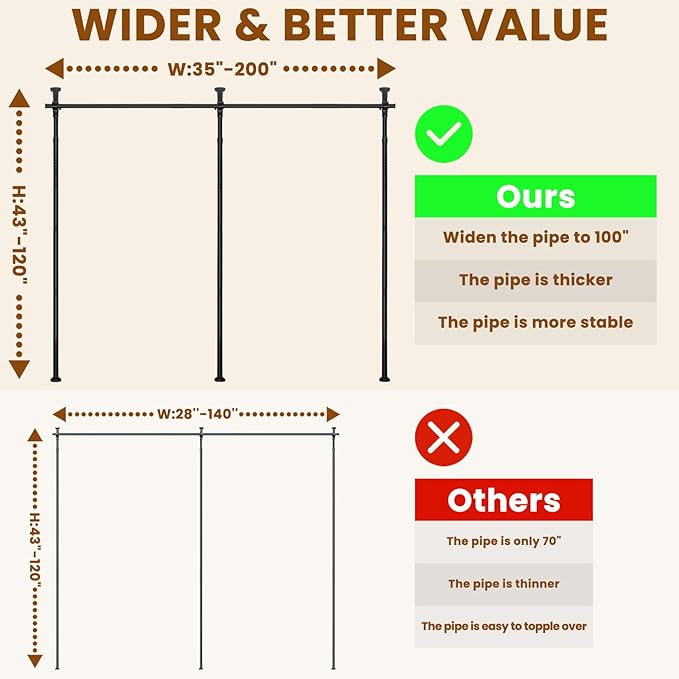 - Customize your space with our highly adjustable system. the width extends from 72 to 200 inches, and the height adjusts from 43 to 122 inches by adding or removing extension rods for enhanced adaptability to various room layouts.