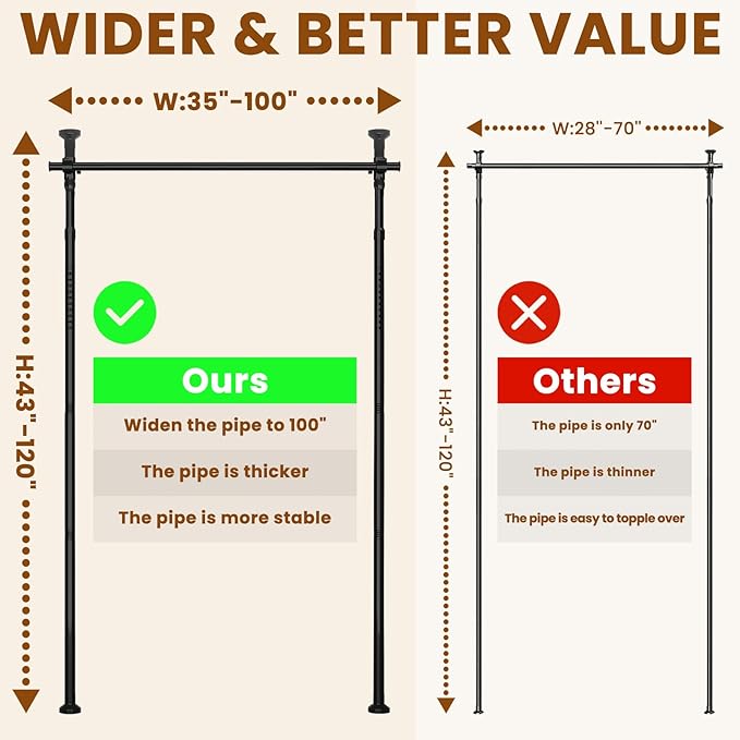 - Customize your space with our highly adjustable system. the width extends from 35 to 100 inches, and the height adjusts from 43 to 121 inches by adding or removing extension rods for enhanced adaptability to various room layouts.